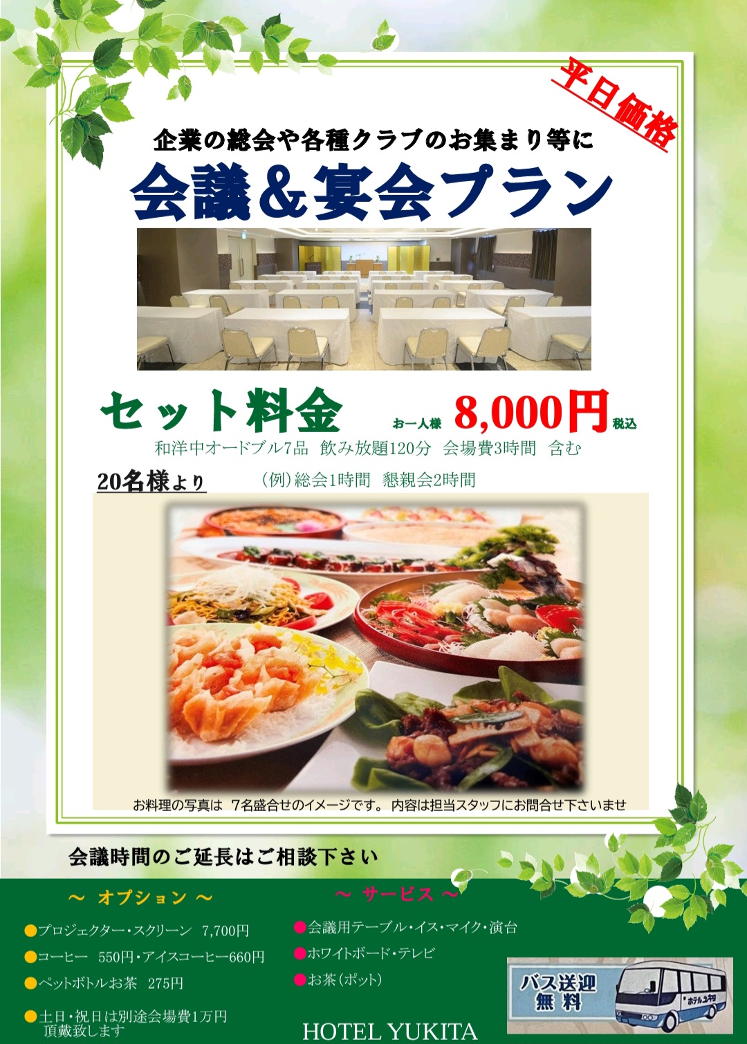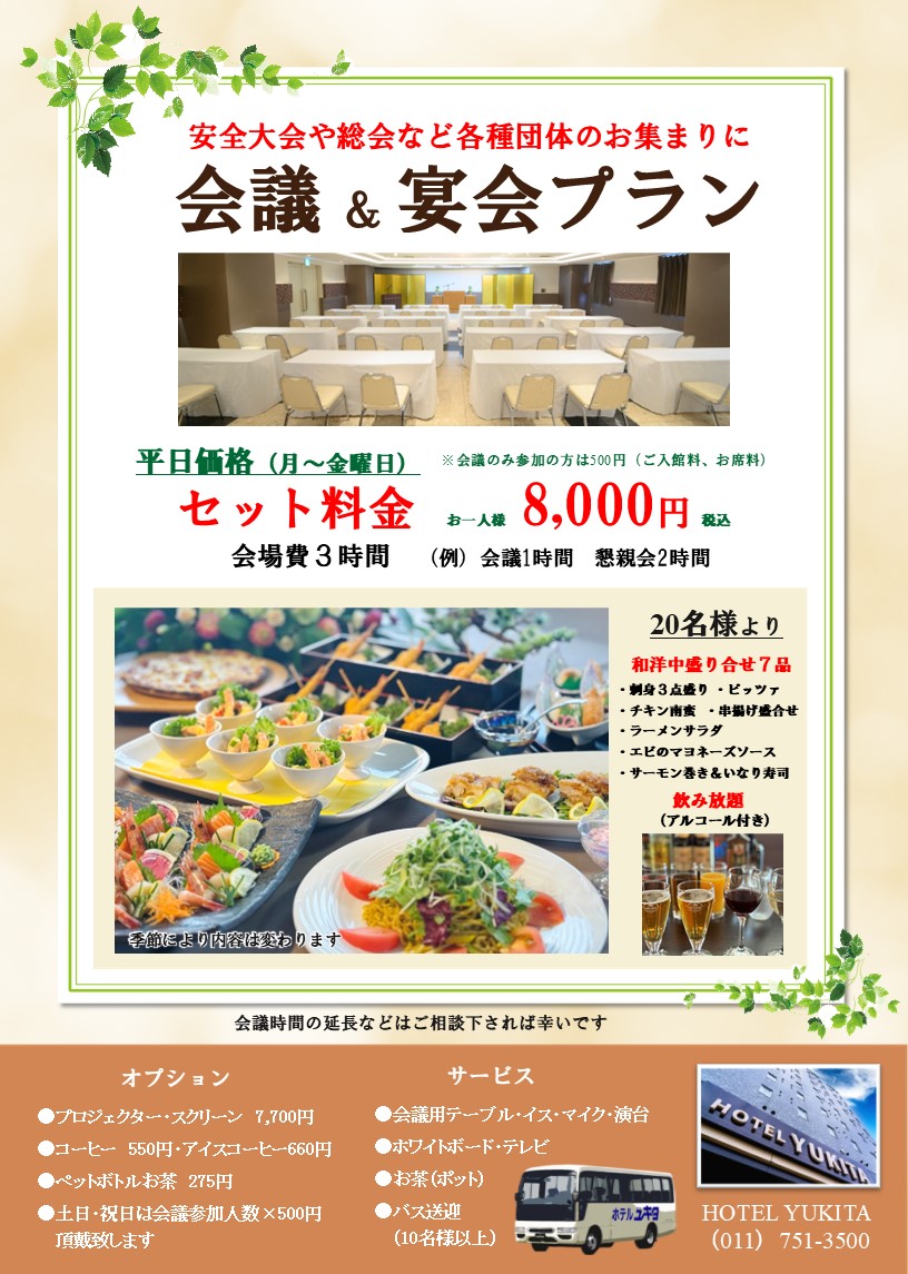 会議&宴会プラン お知らせ yukita はじめに総会を1時間、その後に懇親会を2時間など、企業の総会や各種クラブのお集まり等に適したプランです。お気軽にお問い合わせください。 ご予約・お問い合わせはこちらまで TEL:011-751-3500